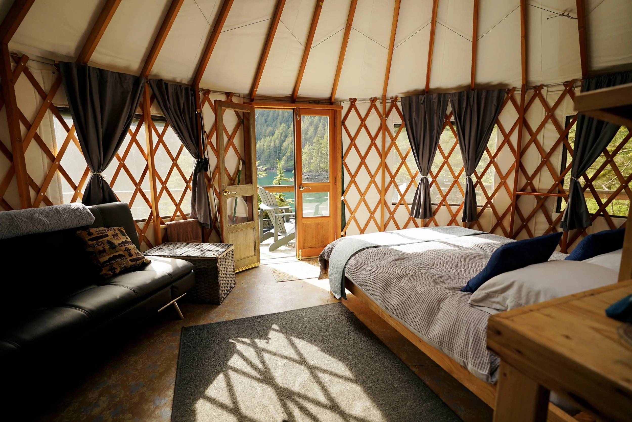 is a remote yurt resort accessible only by private boat featuring eight eco-friendly glamping yurts. Each yurt has a private bathroom, hot running water, and a fully- functional kitchen, propane fireplace for comfort, as well as a queen-size bed and full-size futon. Yurts include all linens, bedding, and everything you need to prepare your own meals. You only need to bring your clothing plus all food and ice for the duration of your stay (coolers included in every room).
